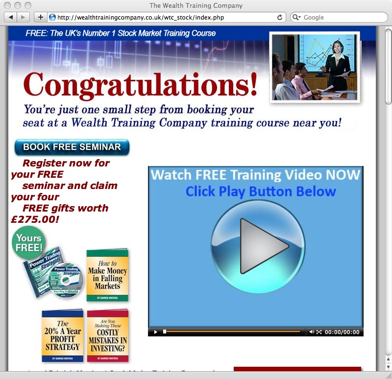 A spot of Google research revealed that The Wealth Training Company isn’t the first company Darren Winters has run that offers stock market training. He previously ran WIN Investing which, as it turns out, has had a few dissatisfied customers in its time and was censured by the Advertising Standards Authority for making unsubstantiated claims in its adverts. It also appears that, despite running a company that claims to be able to teach you how to make money from trading the stock market, Winters has some trouble keeping his own ventures afloat – he was director of a software company that went bankrupt, owing over £250,000 and WIN Investing itself came very close to collapsing in 2009.