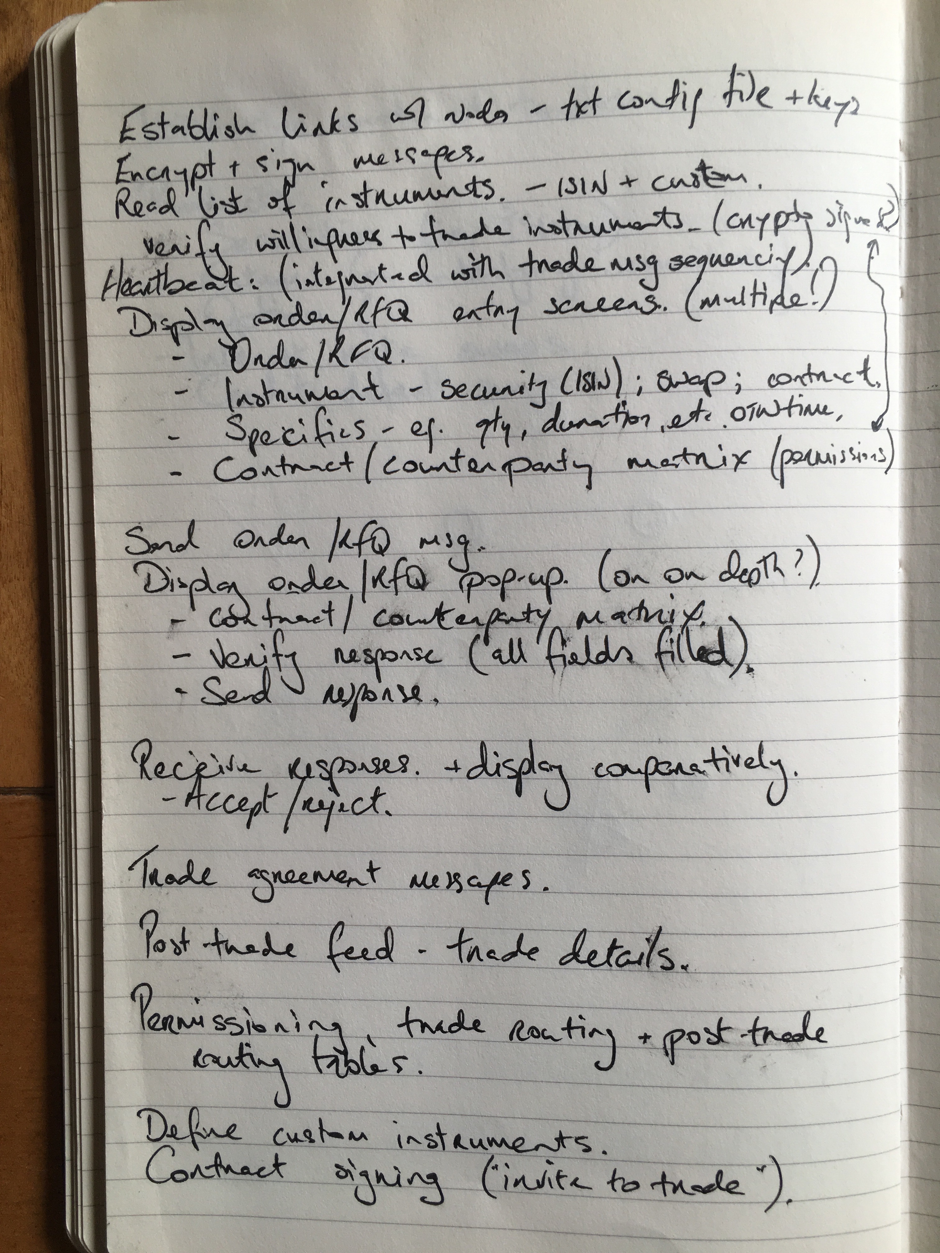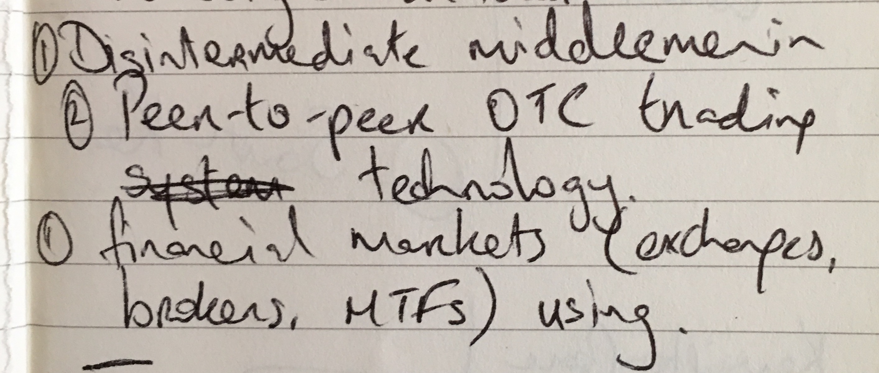 This is an old presentation (original PDF here) outlining an idea I originally had back in 2006 to decentralise the financial markets by allowing counterparties (banks initially, individuals later) to trade directly with one another, bypassing centralised exchanges and brokers.