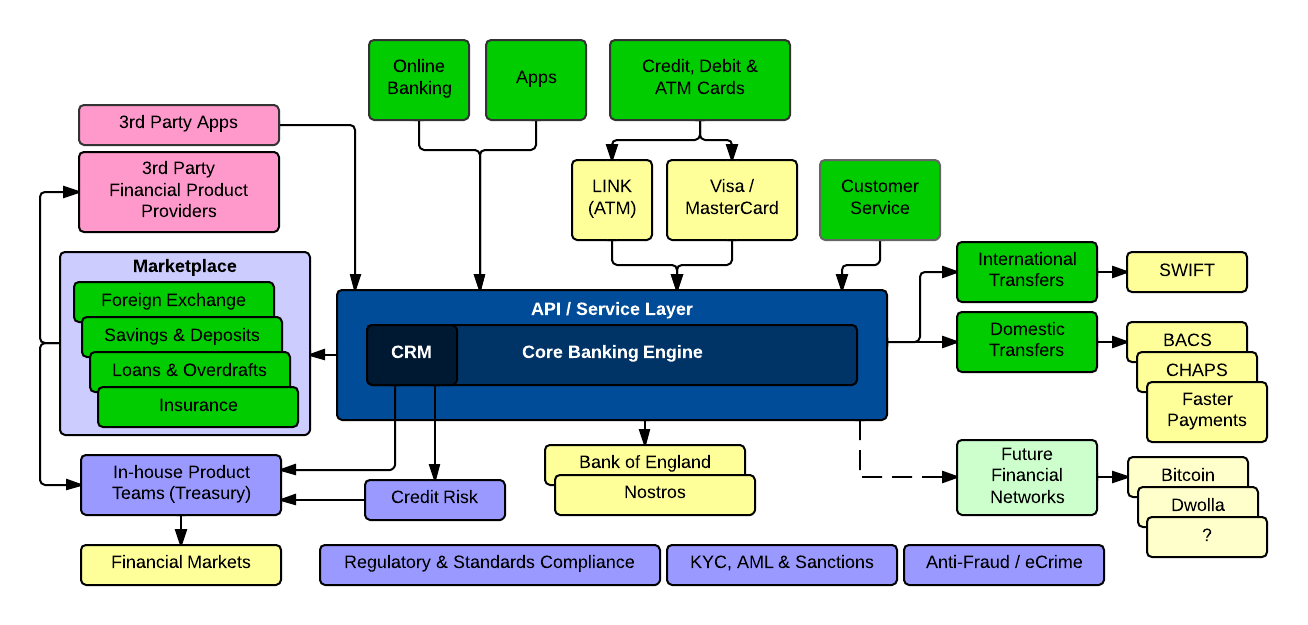 A bank can be broken down into two distinct businesses. The first is the infrastructure required to offer banking services: the banking licence or charter, branches and call centres (increasingly optional), IT systems, ATMs, AML and KYC procedures, connections to domestic inter-bank networks and SWIFT, the ability to issue credit and debit cards, etc. Some of these are revenue-generating (e.g. fees on SWIFT transfers, payment card interchange fees) but, traditionally, retail banks have offered “free” banking to attract customers so that the second business can offer them financial products like credit, overdrafts, loans, savings, investments, pensions, foreign exchange and insurance. This second business has attracted plenty of competition (including startups like Wonga, FundingCircle and TransferWise), but there appears to be little appetite for investing in the infrastructure required to become an actual bank.